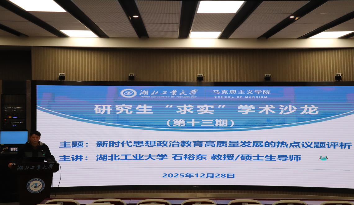 (黄馨怡 供稿 彭欣宇 摄影 丁银河 审核)12月28日,湖北工业大学马克思主义学院在工一五楼VR实验室成功举办第十三期研究生“求实”学术沙龙。本期沙龙邀请马克思主义学院石裕东教授担任主讲嘉宾,主题为“新时代思想政治教育高质量发展的热点议题评析”。学院100余位师生参加了讲座,讲座由副院长李睿教授主持。