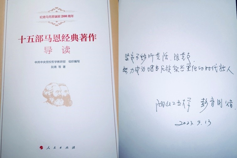 在西区十四栋322宿舍,彭育园向同学们赠送了自己亲笔题写了新生寄语的专业书籍《十五部马恩经典著作导读》,强调了学好马克思主义学科的重要性,嘱咐同学们要尽快调整状态,适应大学新生活。322宿舍的雷铭宇同学在收到新生礼物的同时,也立刻回赠了一份特别的礼物:本科毕业典礼上他和彭育园书记的合影。
