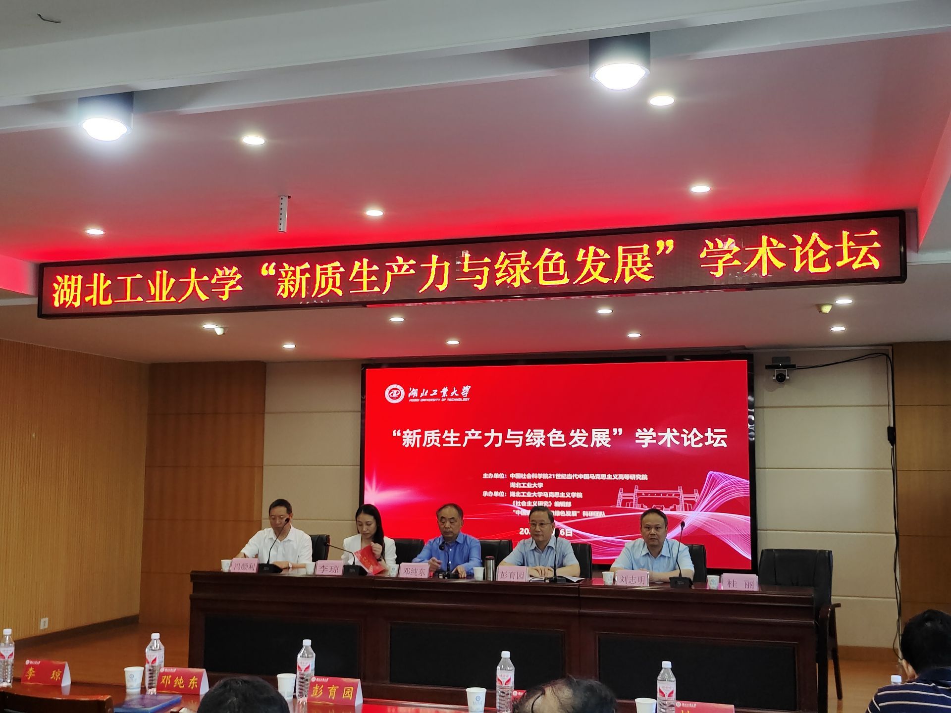 7月6日,“新质生产力与绿色发展”学术论坛在湖北工业大学举办。论坛围绕“新质生产力与绿色发展”这一主题,深入研讨新时代发展新质生产力、推进绿色发展、建设中国式现代化的相关问题。湖北工业大学党委书记彭育园出席会议并致辞,省委宣传部理论处负责人李琼到会并发表重要讲话,湖北工业大学党委常委、组织部部长桂丽出席会议并主持开幕式。中国社会科学院大学21世纪当代中国马克思主义高等研究院原党委书记、院长、教授邓纯东等10位知名学者在会上做了主旨报告。