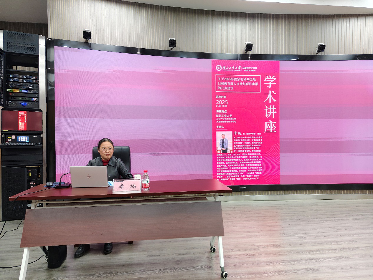 为进一步提升学院教师参与国家级项目申报的能力,助力学科高质量发展,1月9日下午,学院邀请武汉大学马克思主义学院二级教授、博士生导师、马克思主义中国化研究学科带头人李楠来学院开展学术讲座,指导我院2025年国家社科基金申报。学院领导班子及全体教职工参加会议,会议由院长丁银河主持。