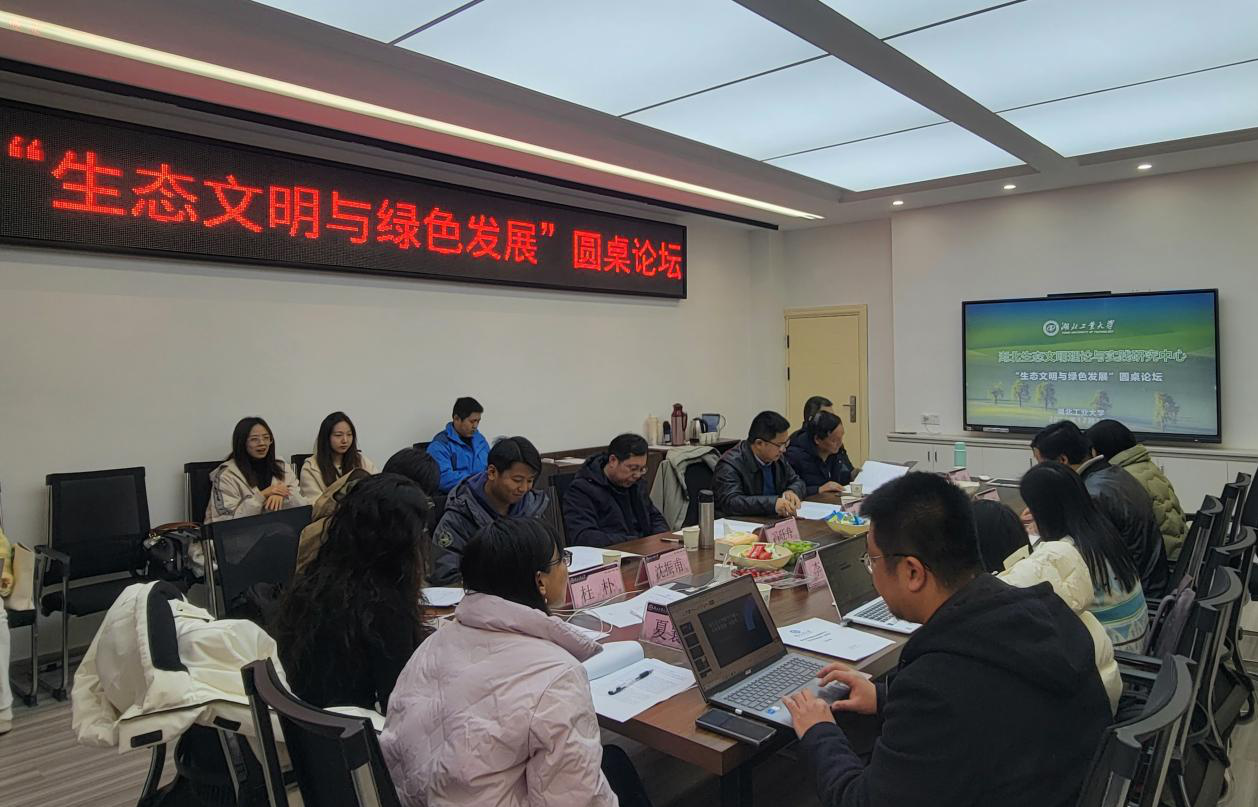 12月17日,“生态文明与绿色发展”圆桌论坛在湖北工业大学成功召开。会议由湖北工业大学马克思主义学院主办,湖北工业大学湖北生态文明理论与实践研究中心承办。本届论坛聚焦“贯彻落实党的二十届三中全会精神,助推绿色发展与生态文明创新实践”主题,共同探讨了新时代中国生态文明研究的使命任务与前沿热点,学生生态文明素养培育等相关问题。中国地质大学(武汉)马克思主义学院副院长陈军教授、中南财经政法大学马克思主义学院冯旺舟教授做主旨报告,武昌理工学院马克思主义学院院长彭贤则教授、副院长李泽教授,湖北生态文明理论与实践研究中心全体教师、马克思主义中国化研究专业、社会治理专业师生代表参会。会议由湖北工业大学湖北生态文明理论与实践研究中心主任杨倩博士主持,湖北工业大学马克思主义学院院长丁银河、副院长华倩出席论坛。